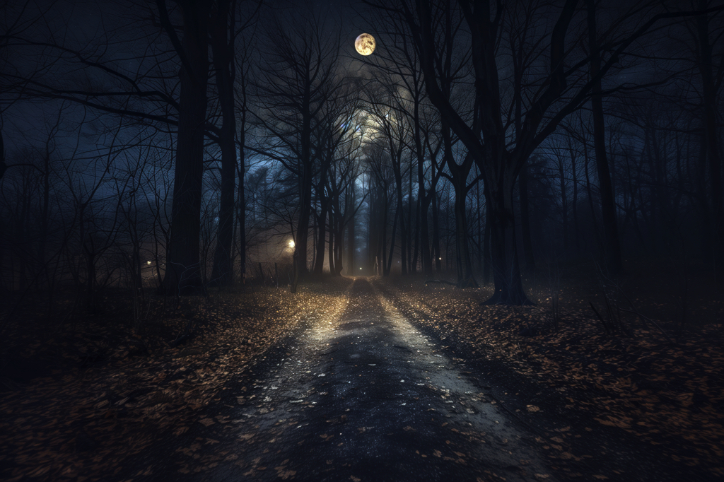 A dark forest road with tall trees, blue moonlight shining through the leaves