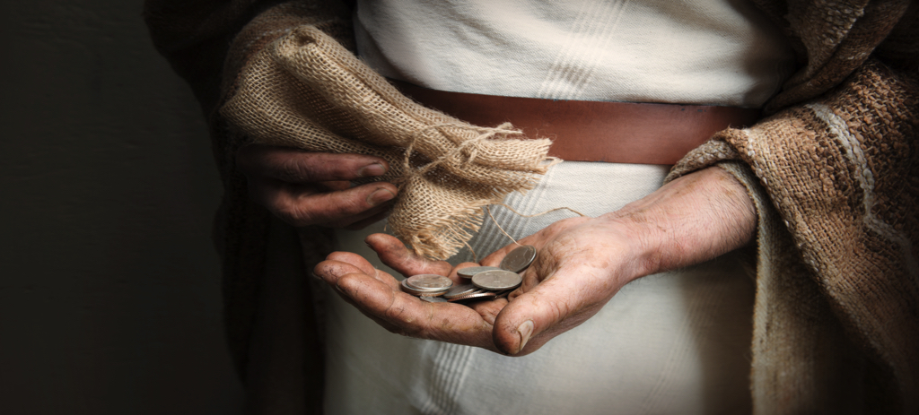 A handful of silver coins in the hands of an old man