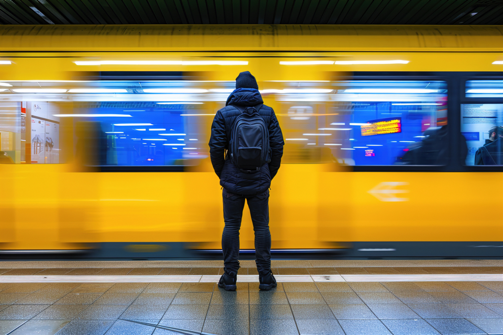 A man waits in a subway station, a blurred train passes quickly in front of his eyes.