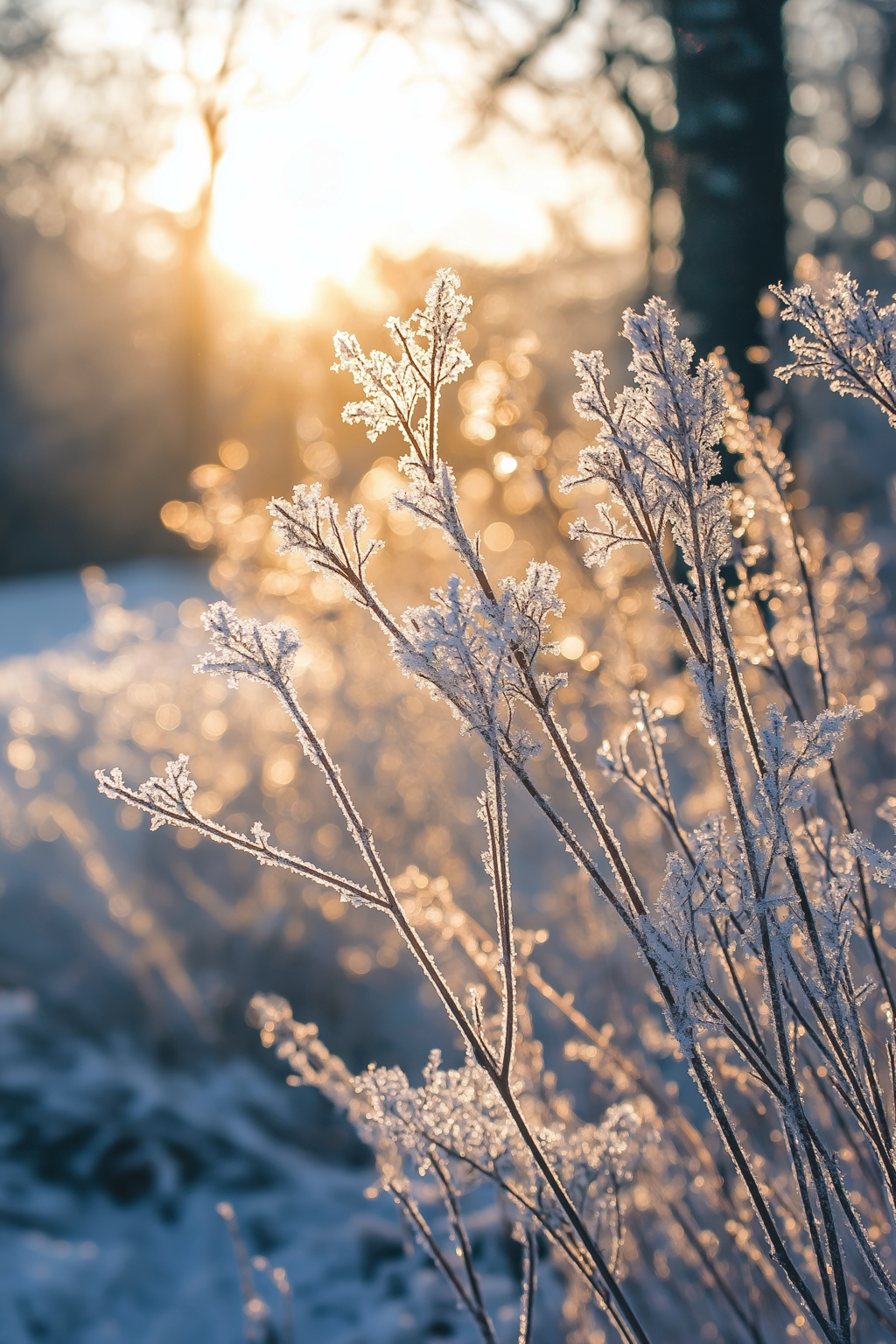 Frozen branches shimmer in the early sunlight, representing the beauty of a winter morning.