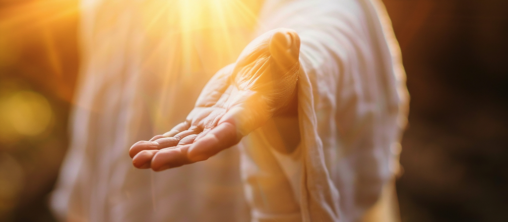 Jesus reaching out his hand against dark background Resurrected Jesus Christ reaching out hand and praying