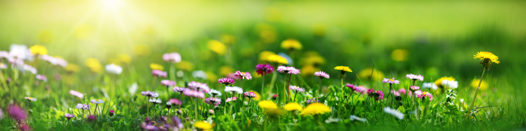 Meadow with lots of white and pink spring daisy flowers and yellow dandelions in sunny day