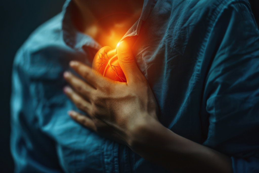 Person clutching their chest with a glowing heart symbolizing love, health, or emotion in a dramatic representation.