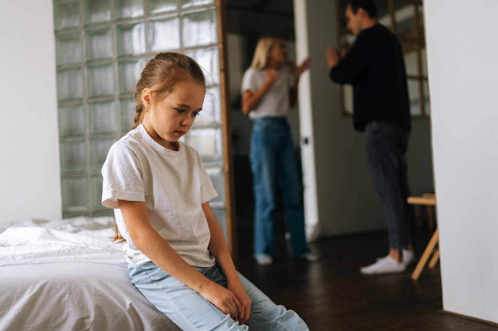 Portrait of depressed cute little daughter sadness looking down sitting on couch during parents quarrelling and fighting in living room on background. Concept of family problems, conflict, crisis.