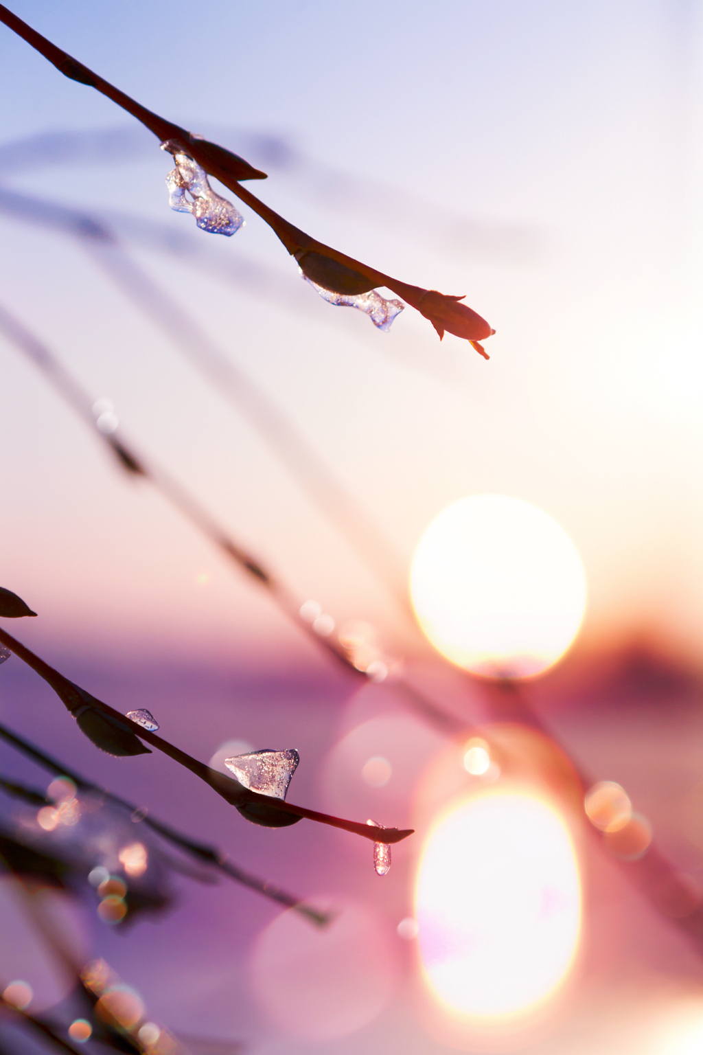 Spring tree branch against blurred sunset sky background