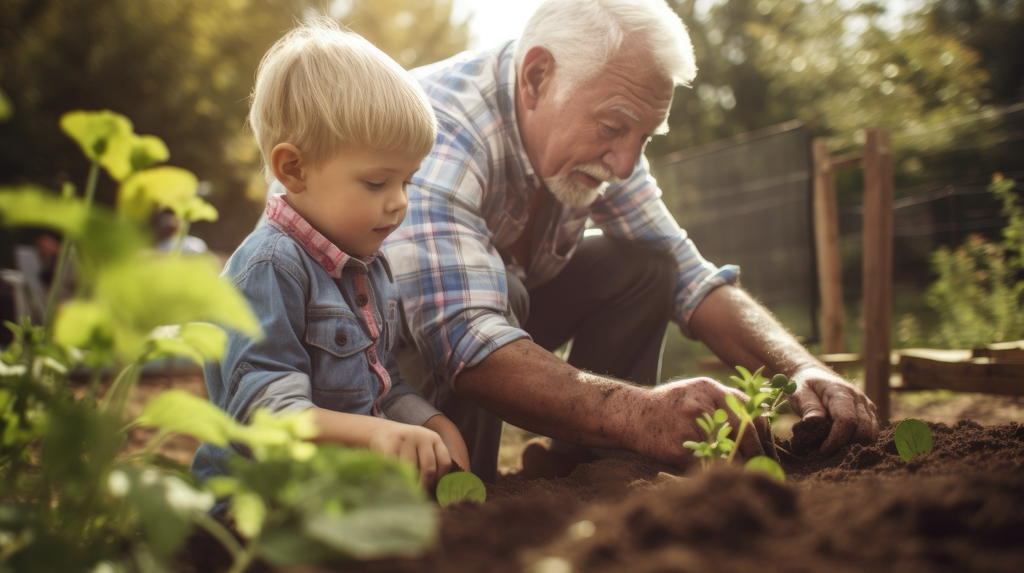 Summer 2023 atmosphere. A grandfather and his grandchild planting flowers or vegetables in the garden. Generative ai.