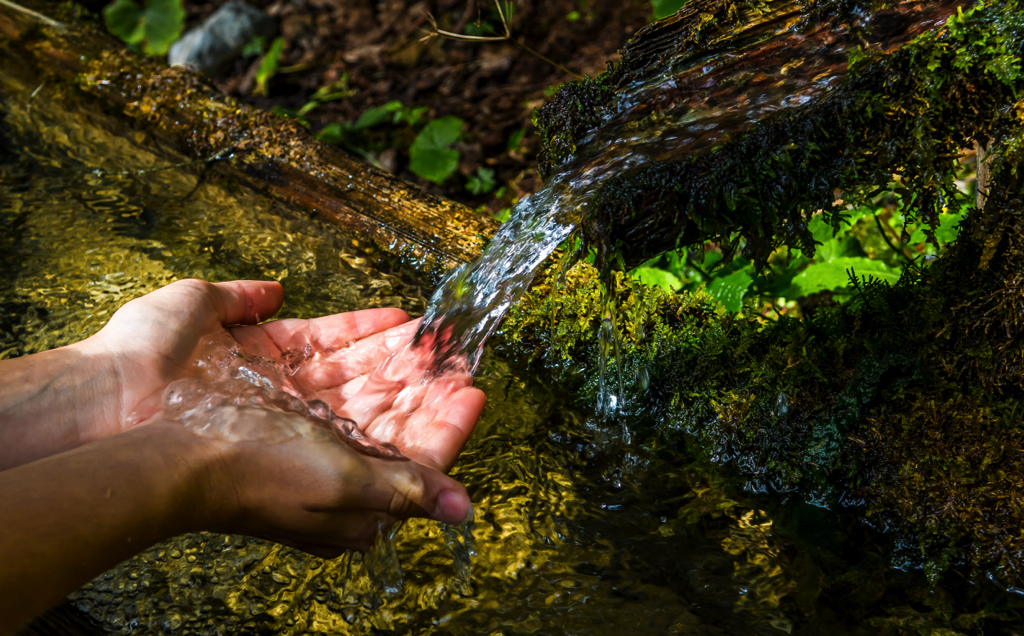 Washing Hands And Drink From A Spring With Clear And Cold Mountain Water